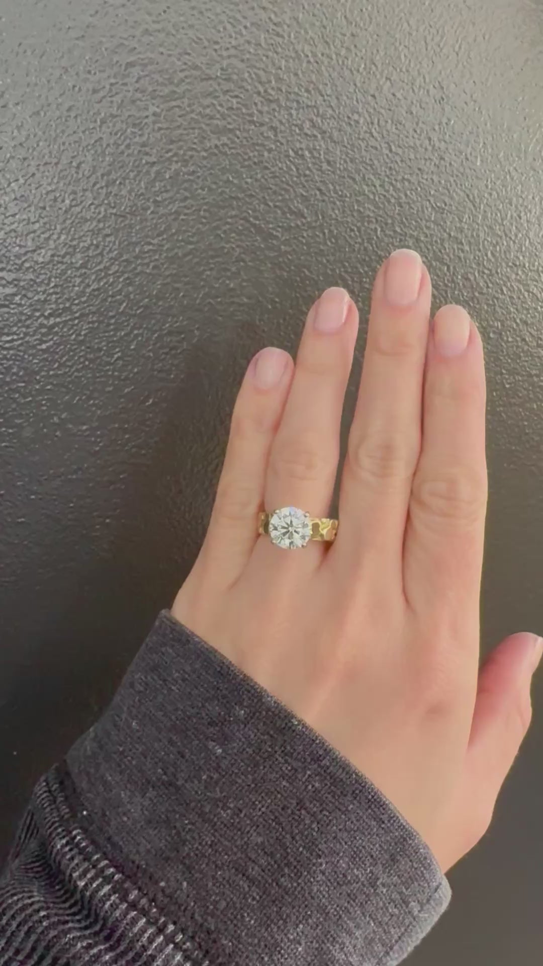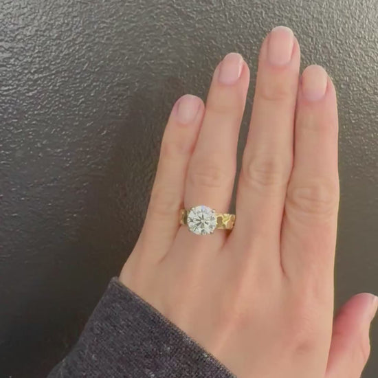 At the center is a breathtaking 3.04 carat lab-grown round brilliant diamond, expertly set to highlight both sparkle and structure. The diamond features a coveted D color (colorless) diamond with VVS2 clarity, offering exceptional brilliance and fire from every angle. The organic texture of the vintage 14k gold nugget band contrasts beautifully with the clean, luminous diamond—creating a ring that feels both timeless and contemporary.
