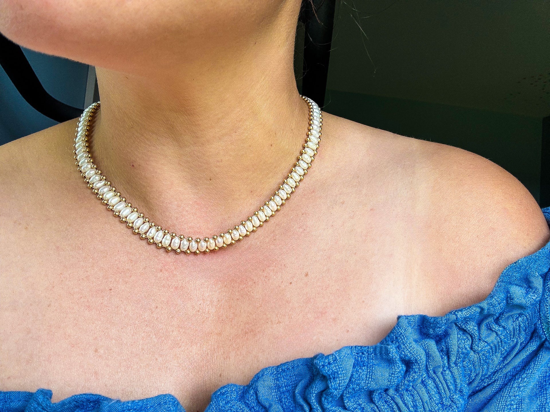 Say goodbye to your Grandmothers outdated pearls and hello to timeless elegance. Measuring 16 inches in length, this classic piece features luminous white freshwater pearls delicately framed by polished 14k yellow gold beads, creating a striking contrast and a rich texture. The alternating pattern of pearls and gold beads lends a refined and graceful look, perfect for both everyday sophistication and special occasions. Finished with a secure vintage-style filigree clasp, this necklace is a beautiful blend of craftsmanship and charm — a perfect heirloom piece for any jewelry lover.