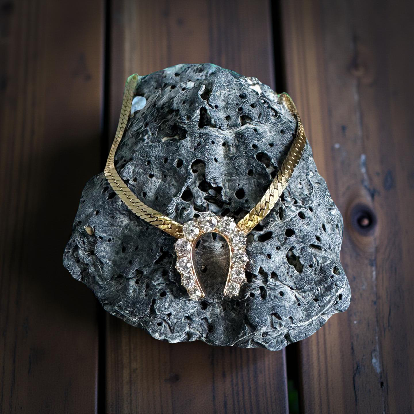 Each old mine cut diamond reflects the charm and character of 19th-century craftsmanship, while the gold horseshoe symbolizes luck and protection. The bold yet refined design of the herringbone chain adds a sleek, luxurious touch, making this necklace perfect for layering or wearing as a statement on its own.