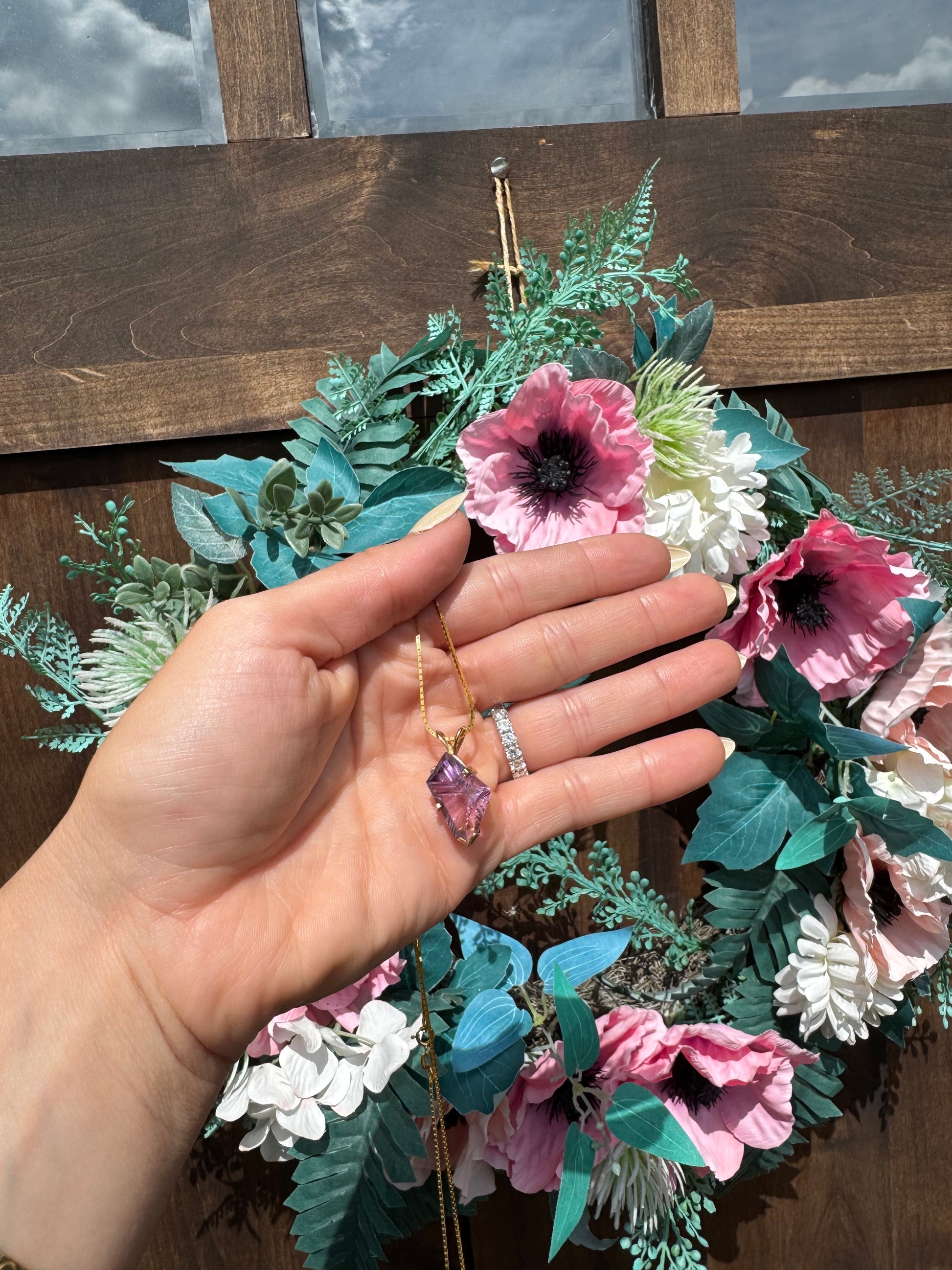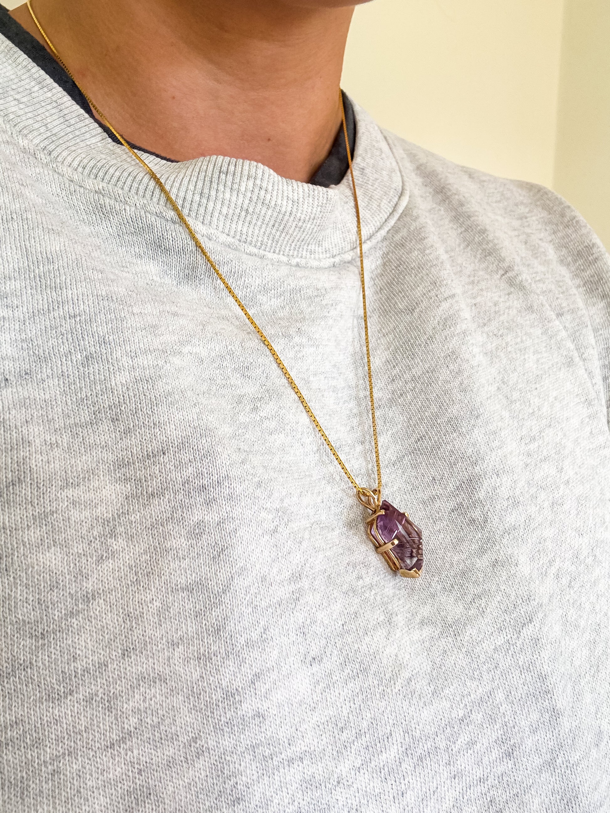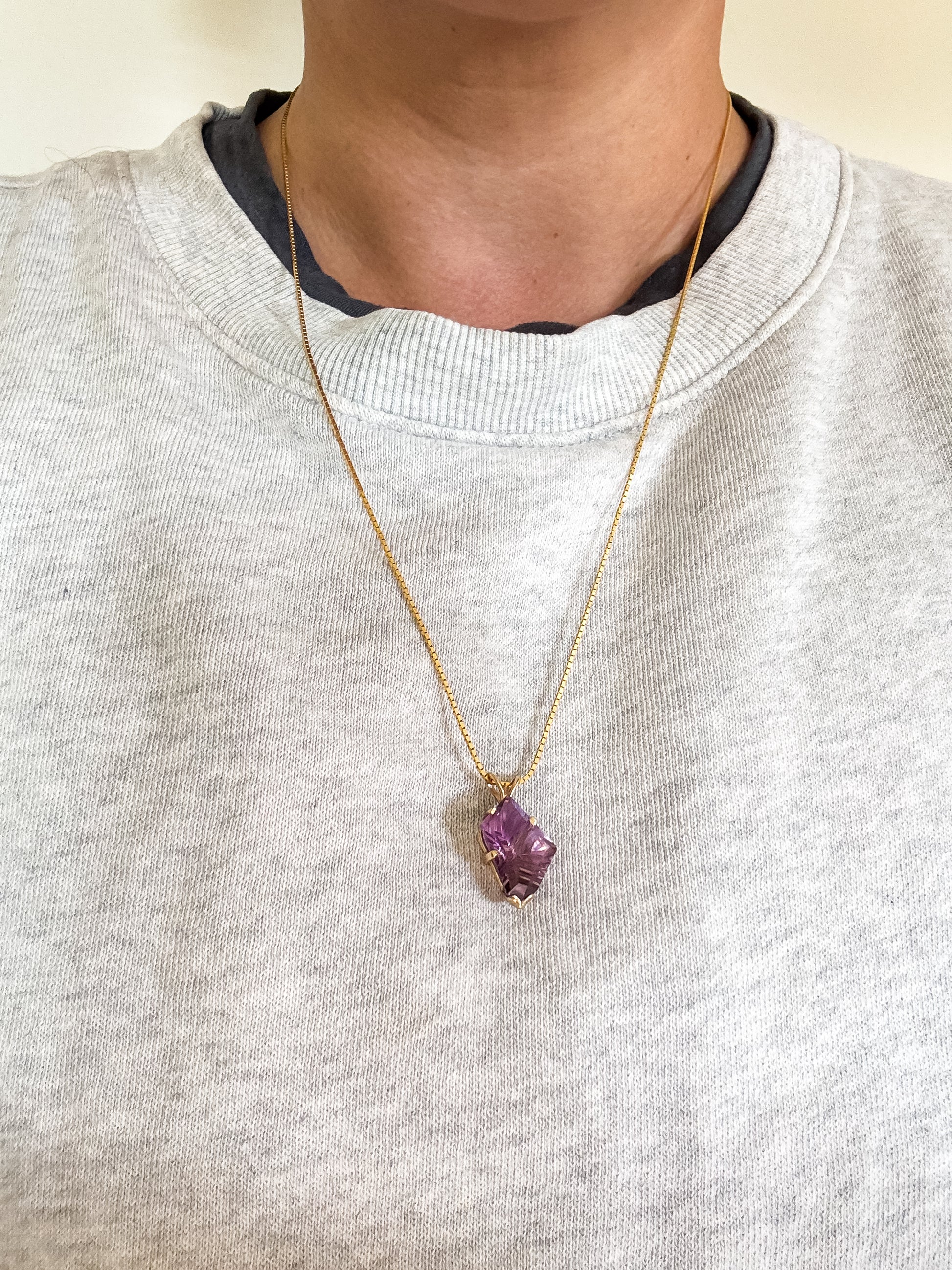 This elegant vintage necklace features a striking unique cut amethyst gemstone pendant set in rich 14k yellow gold. The pendant measures 1 inch in length, showcasing the amethyst’s vibrant purple hue with beautiful faceting that catches the light effortlessly. It hangs gracefully from a 23-inch 14k yellow gold chain, offering a timeless and versatile look that can be worn alone or layered with other favorites.