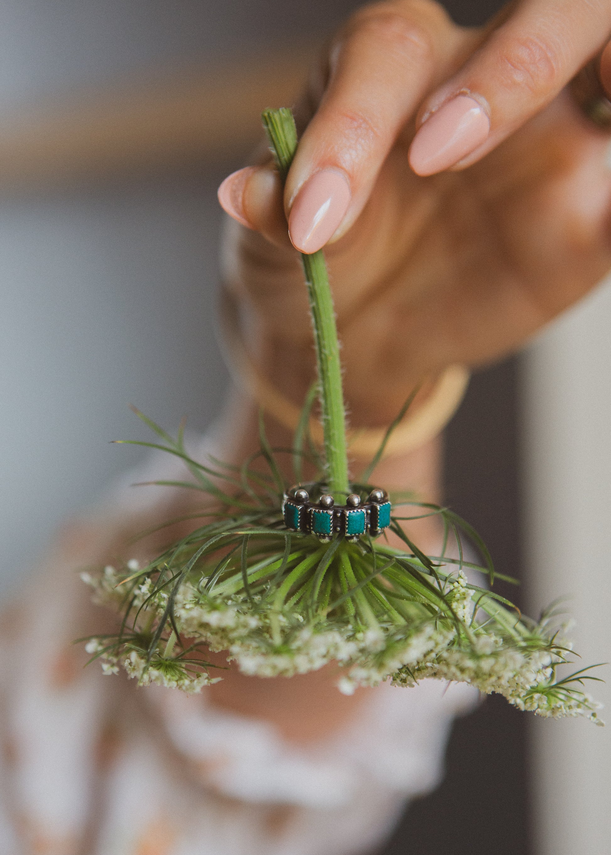Exude unique Southwestern charm like no other with this vintage 1950s Zuni sterling silver and turquoise ring. Handcrafted by skilled Zuni artisans, this stunning piece features a classic cluster design, showcasing vibrant hand-cut turquoise. Each stone is delicately set in fine sawtooth bezels, all mounted on a sturdy sterling silver base with hand-stamped details that reflect traditional Native American craftsmanship.