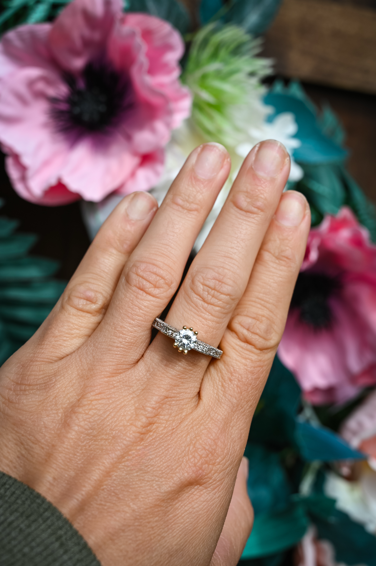 Add timeless sparkle to your hand with this vintage Diamonique ring. Crafted in warm 14k yellow gold, it features a round brilliant .50ct cubic zirconia at its center, securely held in a six-prong setting. The band is accented with 19 dazzling cubic zirconia side stones, adding extra shimmer and elegance from every angle. Perfect as a statement piece, right-hand ring, or promise ring, or engagement ring. This design combines classic beauty with everyday wearability. Size 7.25